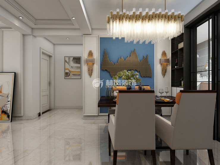 餐厅的墙面背景硬装与客厅的样式线条是一致的加以富有韵律的波形木方来活跃空间.壁灯非常有特点.很符合对个性时尚的烘托