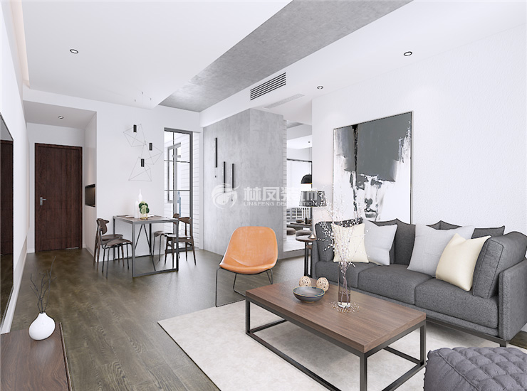 整体色系以黑白灰为主。简约的造型让整个公共区域衔接完美。灰色的地板搭配整体白色天花和墙面色彩的冲击感变的更加强烈。灰色系布艺家具搭配实木纹理造型让整个空间变的与众不同。