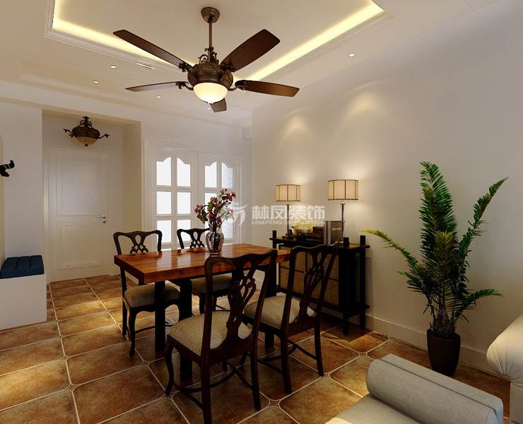 三室两厅一厨两卫,高层整体采用美式风格,色调以深色为主,体现美式的居家感和温馨感。