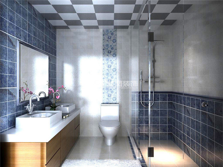 以明尚为主题的卫生间,白蓝色墙砖在奶白色的卫浴的映衬下更加醒目,独立的淋浴空间与卫浴的摆放错落有序。