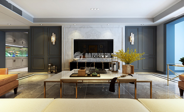 客厅电视背景墙使用的高大尚的石材作为主要装饰,使人眼前一亮,配上灰色的护墙板,显得是那么的协调统一,黑色带有金属的电视柜,给人感觉是那么的高贵,相对应的金属茶几,茶几上的理石台面与电视背景墙呼应的完美无尽。