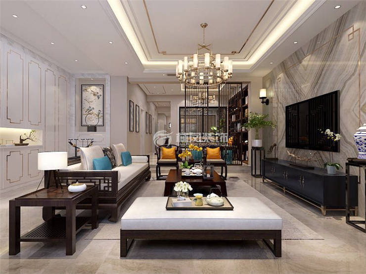 此方案运用新中式装修比较注重古典古香的基调、家具与装饰的搭配。家中的古旧的老家具要善加利用,红木的家具、太师椅、有雕饰的装饰品以及灯光等等都可以增添新中式的原汁原味,整个空间以浅色为主木质结构点缀,体现新中式的古典与素雅,以大理石为电视背景墙,金属边条镶嵌,整体显得高贵而不奢华。