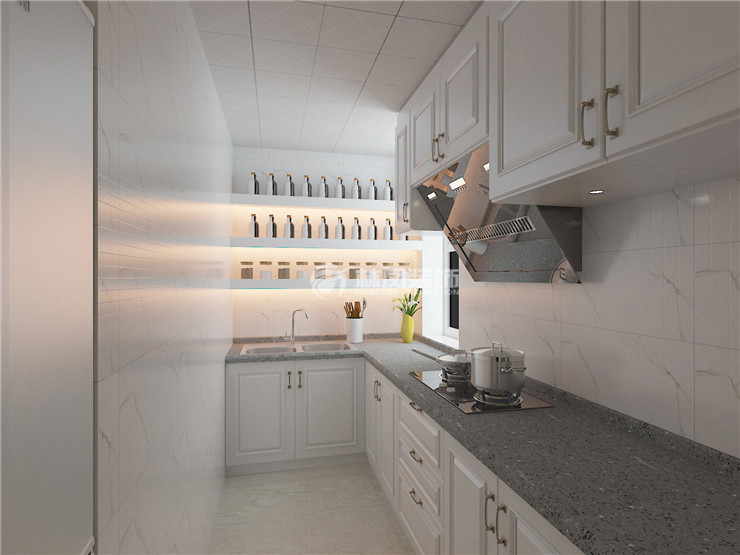 厨房以干净为主,我选择白色瓷砖,白色橱柜,为了让空间不浮躁,我设计了灰色理石台板,干净之余,更时尚。