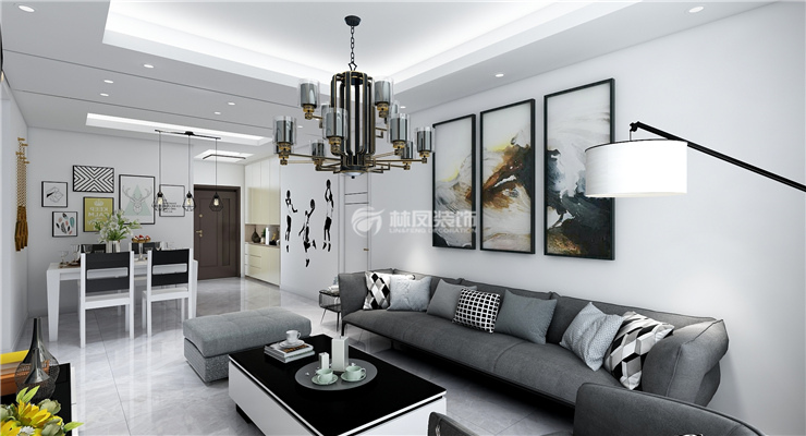 客厅采用了灰色的高亮地砖,客厅整体软装配饰也是颜色采用黑白灰三总颜色进行搭配,沙发、窗帘、电视柜、茶几、背景墙、吊灯,包含了3种色彩使其相互呼应,配上墙上挂画作为点缀让整个空间融为一体背景墙采用硬包材质搭配烤漆玻璃使整个现代感风格更加突出,效果显著!