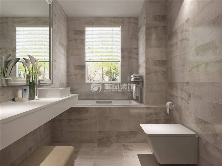 卫生间墙砖为灰色,地砖为深棕色,淋浴房结合桑拿房,干湿分离的处理,双手盆的设置,使整个卫生间宽敞大气,有极简的风范
