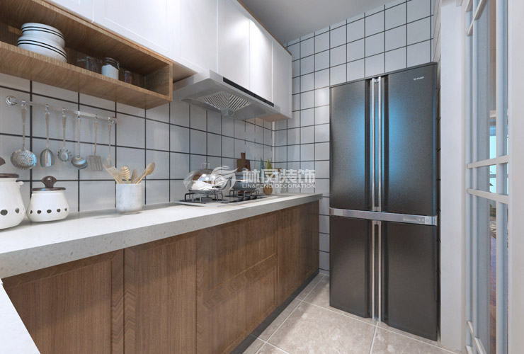 本方案的厨房为封闭式厨房,厨房采用白色的复古墙地砖,易清洗打理,使整体更加的明亮,利用与白色与原木色的橱柜,更加的简洁明亮,使业主在做饭之余能更好的放松心情。