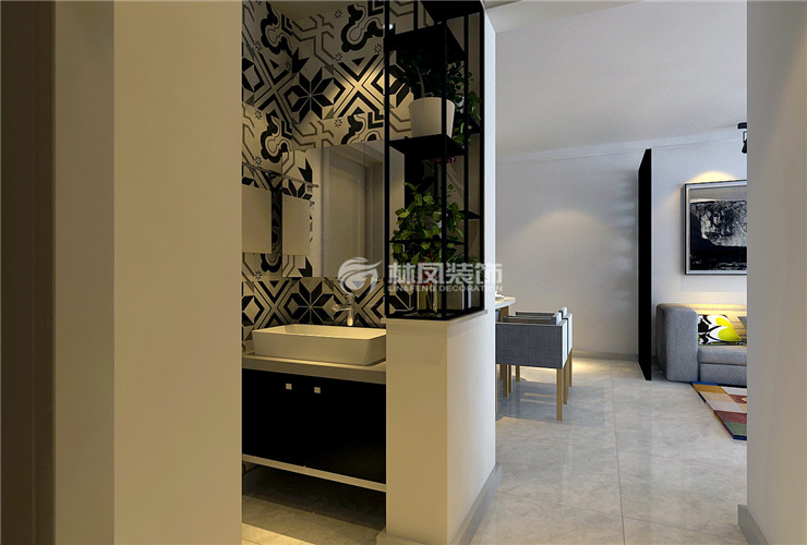 时尚艺术小砖拼贴设计,时尚的吊柜手盆和镜箱卫浴,把原有狭小的空间增添了艺术感,最大的亮点就是镂空的金属隔断墙,因为它使整个空间变得更宽敞。