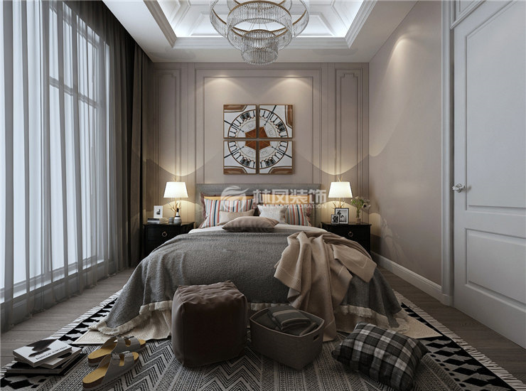卧室设计说明:卧室水休息睡眠的地方,用简单的石膏线线条,勾勒出床头背景,空间层次感更加强烈