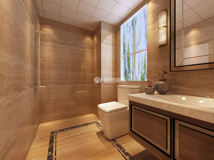卫生间墙面和地面采用同一种理石,手盆选用吊柜,去除了落地柜的沉重,台下盆既方便又实用,从空间上抓住了整体的效果。