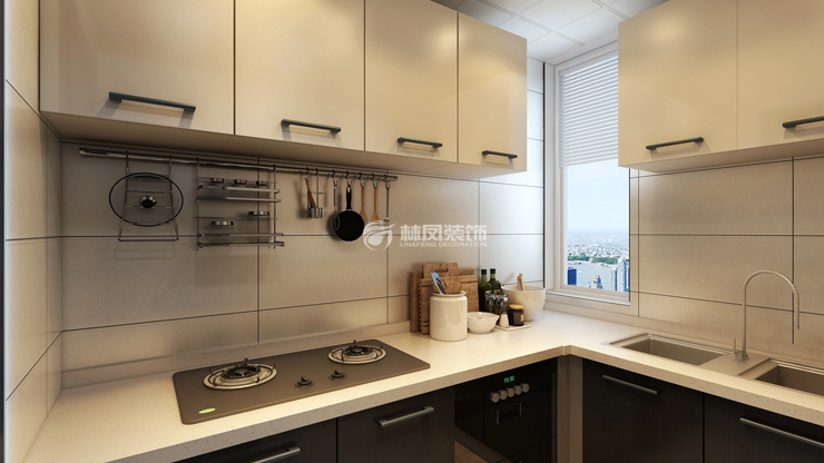 厨房用上白下灰色的橱柜搭配,灰白色的墙砖把看似狭小的空间以一种透视的效果达成纵伸感,白色干净的台面作为过度色来增加厨房的情调,橱柜本身简单的线条在柔光砖的氛围中勾勒出一个洁净舒适的厨房环境。