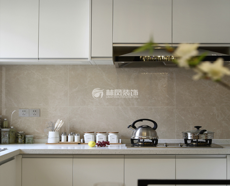 厨房墙选用米黄一点瓷砖、珠光白的钢琴漆橱柜与白色大颗粒的石材台面相结合,拓展其空间视觉效果。显示其明亮大气又不失新中式风格简单大气的韵味。