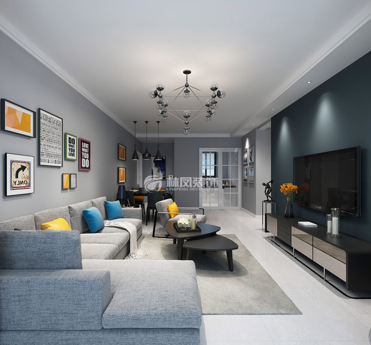 客厅整体墙面以灰色为主,电视墙采用更深的颜色,突出整体空间的层次感。