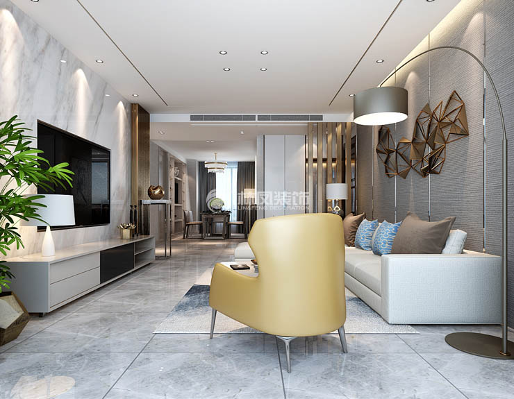 本案的客厅是将原有的露台封进室内,从而达到保暖和增加室内阳台空间的功能,沙发后用灰色布纹理硬包夹亮面钢条做主体颜色和重心感,米白色的沙发再用芒果黄色休闲椅做点缀没电视墙面整体蓝金沙天然大理石,两侧用钛金拉丝色的钢板压槽排列做区域的点缀和材质的分割。