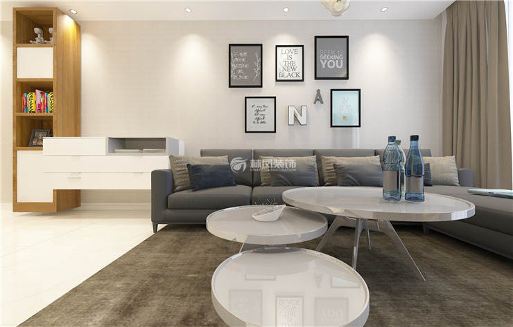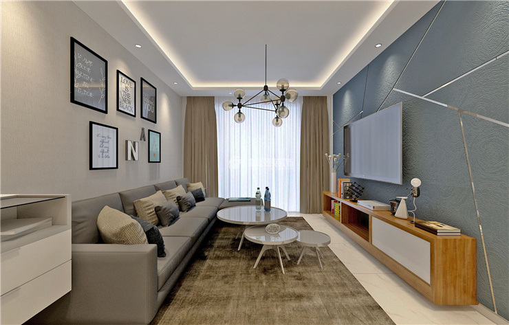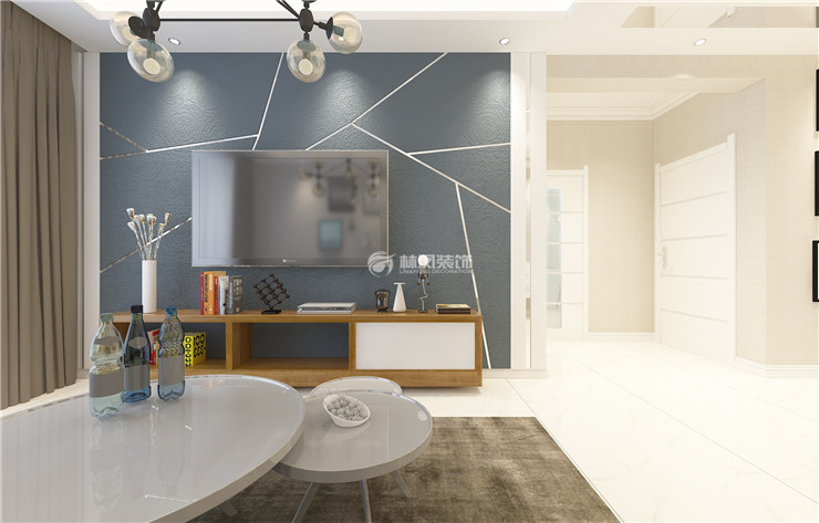 客厅采用爵士白理石纹理瓷砖让空间更加明亮,背景墙采用壁纸与白钢条结合,与茶几明亮的材质呼应。灯的黑色线条与画框呼应。窗帘与块毯,沙发与壁纸采用同色系颜色,让空间更加沉静舒适。