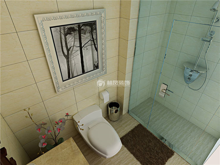 米黄色的砖让空间更温暖,玻璃浴屏让卫生间形成干湿分离,让生活更方便。坐便上面放置一幅画,让空间不再枯燥乏味。