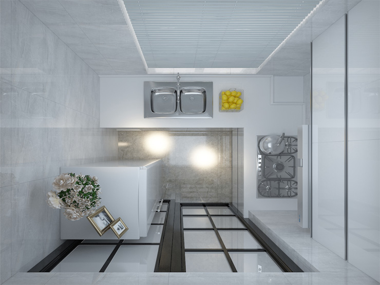 整体瓷砖选用了白色理石纹理横向铺贴的方式,橱柜选用了金色亮光材质,与纯白色台面对比明显,整个空间给人一种干净整洁的感觉。