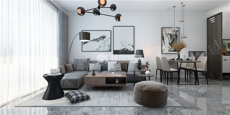 月星中央公园85平2居室现代风格林凤装饰的客厅大地砖根据风格和色彩要求,自然选择灰色抛釉大地砖,大面积单色铺砖所以选择块毯对地面进行区域划分,沙发选择布艺灰色而茶几选择木色,以防色彩单一,沙发背景不做任何造型处理,常规大白墙,通过挂画增添装饰效果,挂画颜色与空间想呼应,画框简单,线条感强,突出现代风格的简单轻松自然。