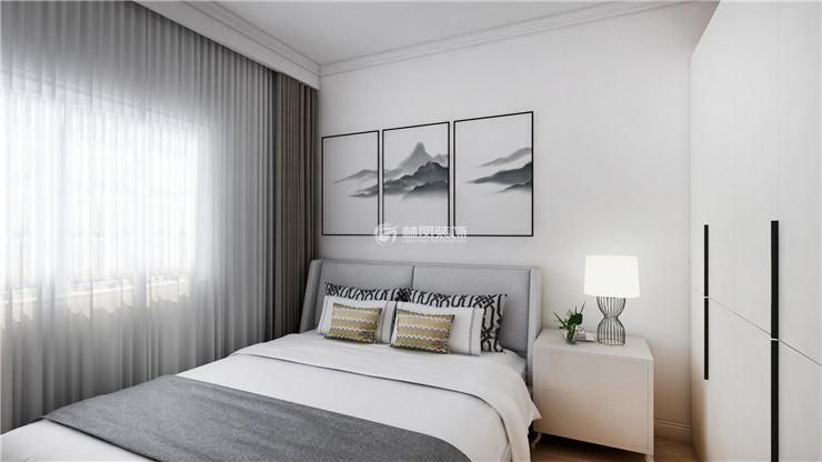 新湖青蓝国际104平3居室现代风格林凤装饰的卧室是休息的地方业主不喜欢太明亮的色彩,卧室选择了铺贴地板以灰色白色为主的卧室,墙上挂画与卧室的床和衣柜颜的色彩都以灰白为主显得统一。