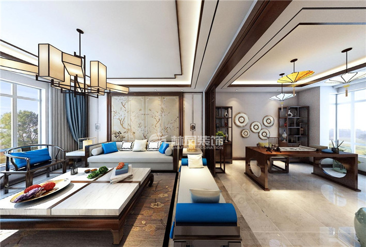 碧桂园太阳城360平3居室中式风格林凤装饰的客厅南北通透,采光较好,运用局部木质元素,由于背景墙较小,结合对称式门口做对称式加大背景墙的整体艺术效果,使空间更整体。