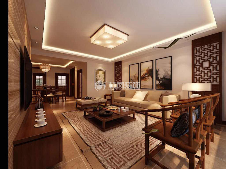 航天大学家属楼140平4居室中式风格林凤装饰的客厅木饰面的质感与柔和的灯光,和暖色的地砖融合在一起,让客厅动静结合,整体营造书香复古的感觉
