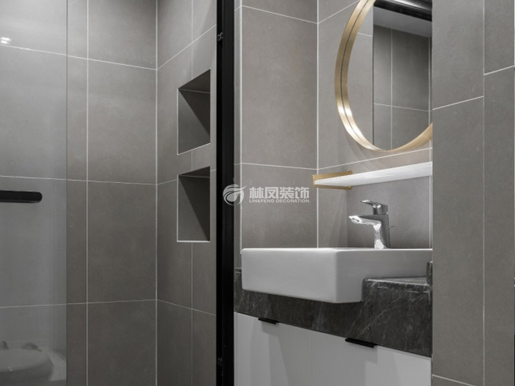 远洋大河宸章130平2居室现代风格林凤装饰的卫生间整体采用灰色作为主色调,搭配白色的洁具显得不是那么的突兀,淋浴区采用浴屏使卫生间更加好打理。