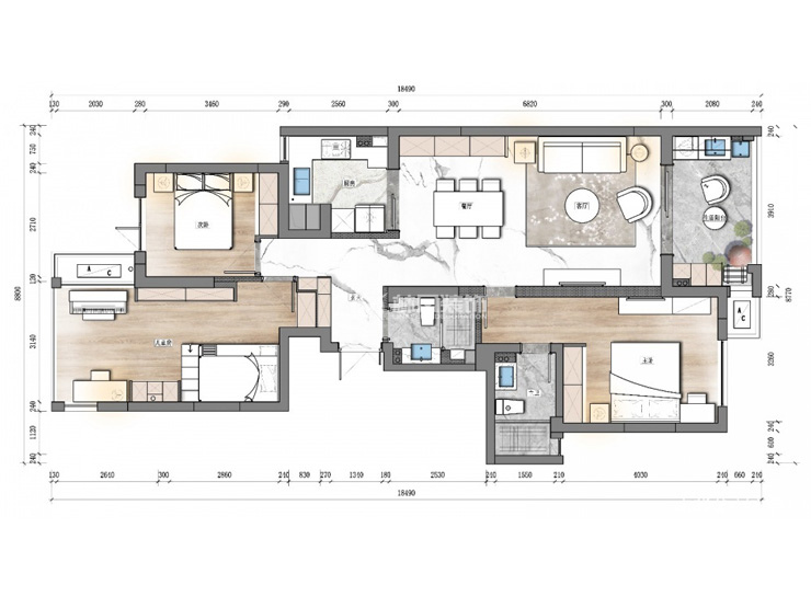 三室两厅一厨两卫,高层整体采用美式风格,色调以深色为主,体现美式的居家感和温馨感。