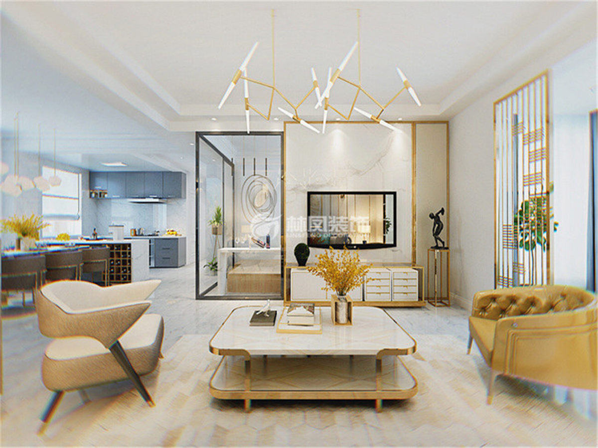 龙湖花千树160平3居室林凤装饰的轻奢风格客厅主基调采用了金属,单人椅、窗帘、电视柜及抱枕采用了不同金黄色层次感,自带飘逸、高贵的气质,既大气又奢侈。主体家具用了米白、金属包边等色调来平衡空间色彩,搭配大理石、金属等材质配饰,保持干净温馨的的感觉,使得客厅看起来富有高级质感。