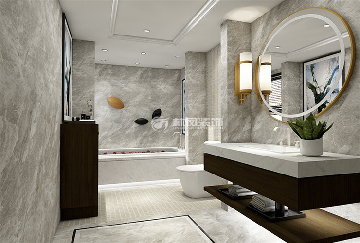 依云美域133平三居室港式风格林凤装饰的卫生间整体盆设计,整体以灰色墙砖来以衬托结局的洁白这枚 ,为主简洁大气十足。