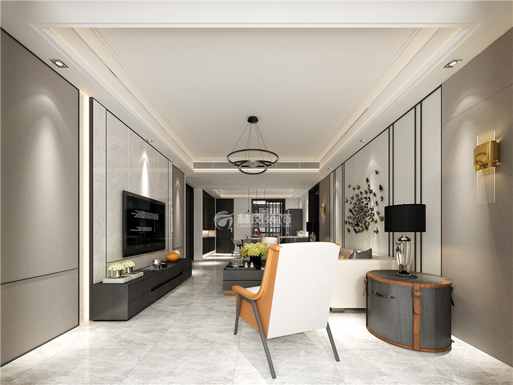 华润24城130平2居室港式风格林凤装饰的客厅的背景墙采用了理石和硬包的结合,将港式发挥到极致,高级灰就是沉稳霸气的经典色。以黑白为硬装部分的主色,橘色系的软装为辅。让整个居家的色调非常舒适和平稳。让人回到家之后心能平和下来。