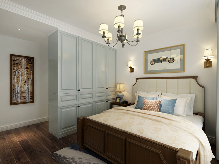 龙湖西府原著115平3居室新中式风格林凤装饰的卧室中以其舒适性及功能性为主要的设计理念。在卧室内,采用淡蓝色衣柜配以木色家具,让次空间在沉稳的定调基础上加入了一些宁静之美,吊灯的设计在夜晚照射出来的光影效果,更能为业主睡眠空间增加一丝浪漫气息。