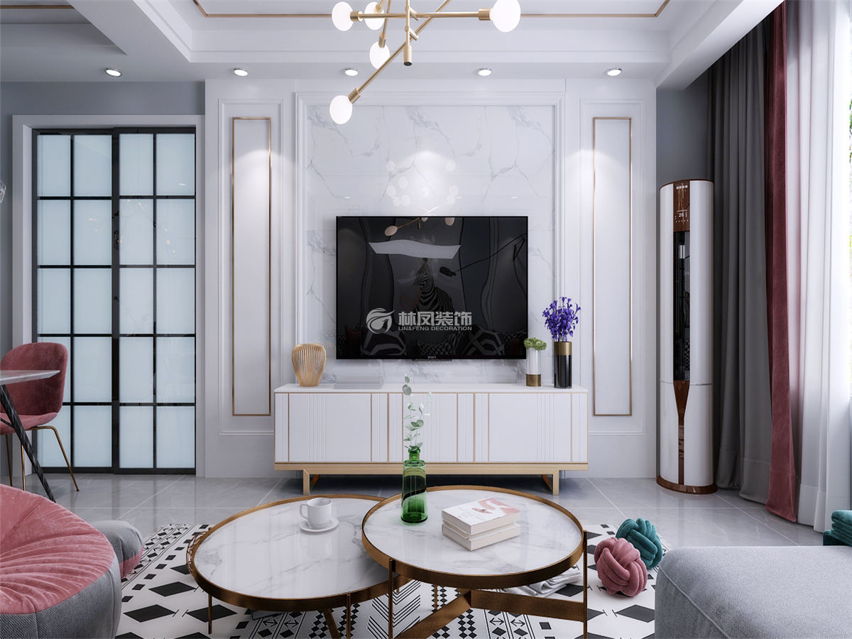 圣诺园80平2居室现代风格林凤装饰的客厅背景墙采用石材和墙板设计结合,样板设计手法中间由玫瑰金收边,与沙发背景一致,棚芯也采用玫瑰金收边,上下呼应现代轻奢更要凸显,空间用了枣红色和墨绿色做为点缀色,使整个空间的气氛更加活跃。