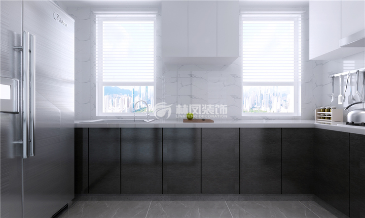 圣诺园80平2居室现代风格林凤装饰的墙面砖选白色色的,橱柜材质门板岩石板,为了更加的凸显层次感选择深色的柜体灰色的台面,使空间上有更好的体现。