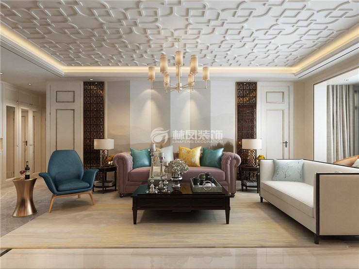 丁香水岸140平3居室轻奢风格林凤装饰的客厅电视背景为大理石壁炉的大背景效果,投影设计取消常规客厅电视背景,亮色深色书柜作为搭色点缀,即为储藏功能。
