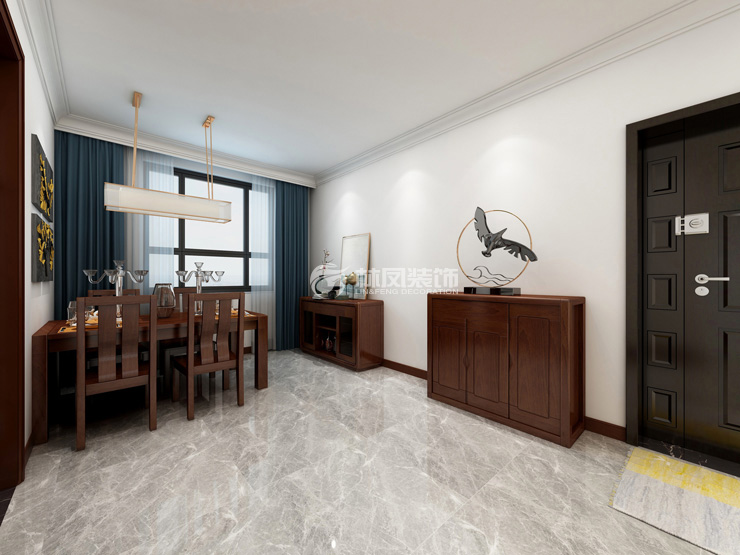 雅居乐花园145平3居室新中式风格林凤装饰的餐厅空间很大,但是餐厅背景墙空间比较小,并且应业主要求餐桌想靠在墙边,因此在软装配饰方面采用了一定的设计,四幅组合画恰到呼应了棚顶的餐吊,黄色的画品与黄色金属灯饰巧妙的提亮了餐厅的色调,让主人用餐更加有一种愉悦的心情!