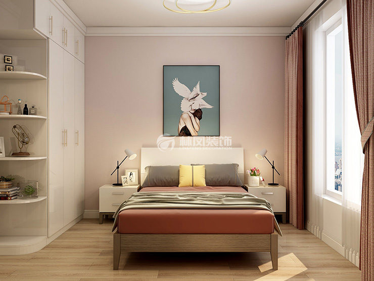 卧室床头采用粉色背景,配合粉色窗帘,完全展现业主的一颗少女心,在这种氛围中休息完全是一种享受。