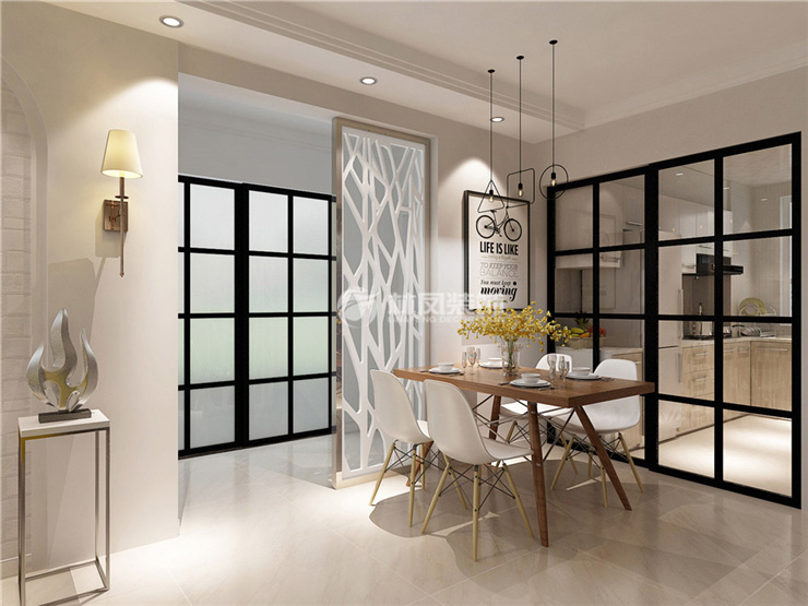 中航城•两河流域87平2居室现代风格林凤装饰的餐厅空间摆放餐桌,尺寸不够,设计师设计了一段造型隔断,延长了餐厅墙面的长度,电表箱配上概念性挂画,简简单单的餐厅氛围就烘托出来了。