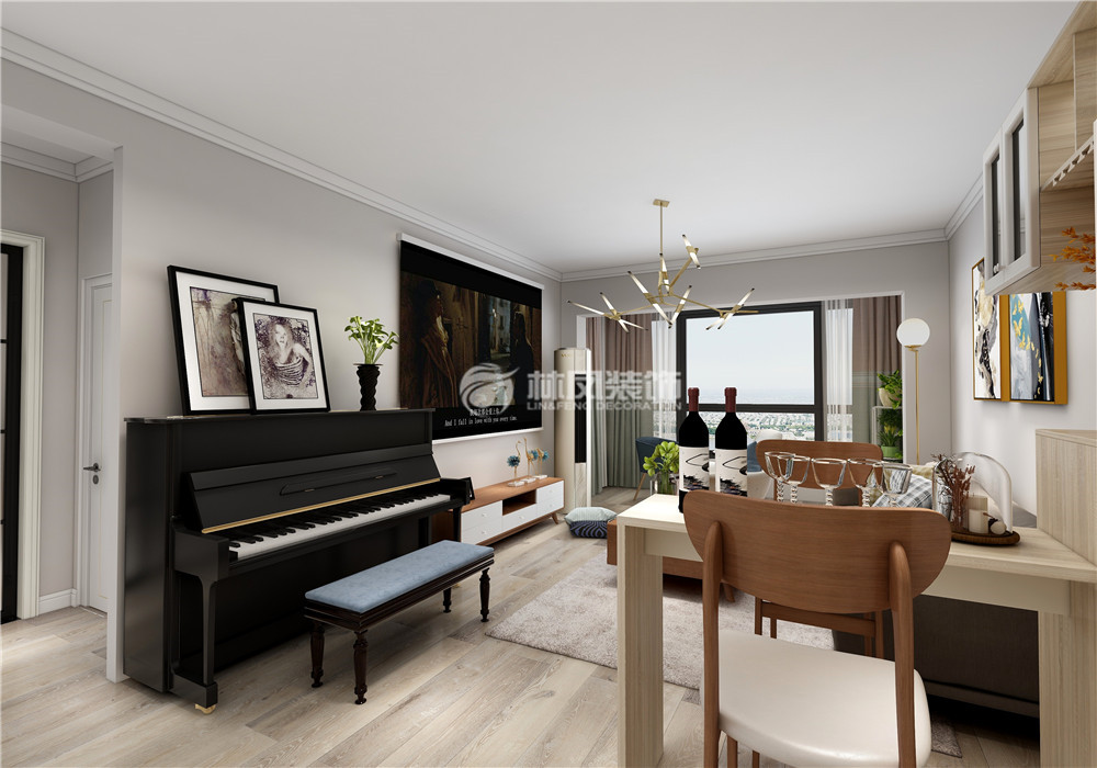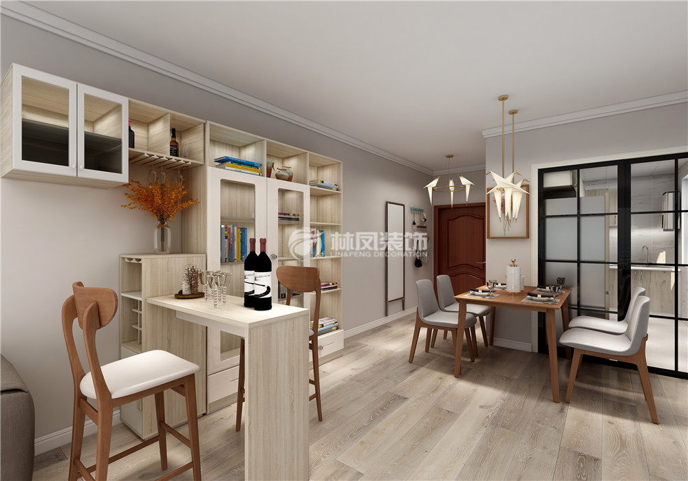 中海和平之门89平2居室北欧风格林凤装饰的餐厅主要也是以棚线为主,北欧风格的餐座椅搭配装饰吊灯使整个设计更加完美。