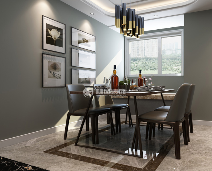 金地檀府130平3居室现代风格林凤装饰的餐厅整体空间超级大,可以满足业主平时的吃饭休闲,又可以满足招待朋友时的聚餐畅谈。厨房和餐厅也在一起 开放式的厨房和餐厅在一起就像一对多年在一起的好朋友一样。西厨在外有一个小吧台 朋友来家一起坐在吧台上喝杯红酒聊聊家常、工作为双方的聊天提供了气氛也让人感到一种不拘束的愉快感。