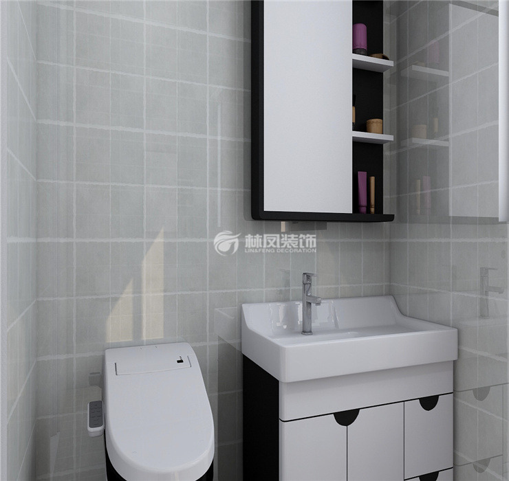 中瑞北欧云著83平2居室北欧风格林凤装饰的卫生间空间比较小,在颜色上以浅色为主,用烤漆的柜子,更加明亮一些。