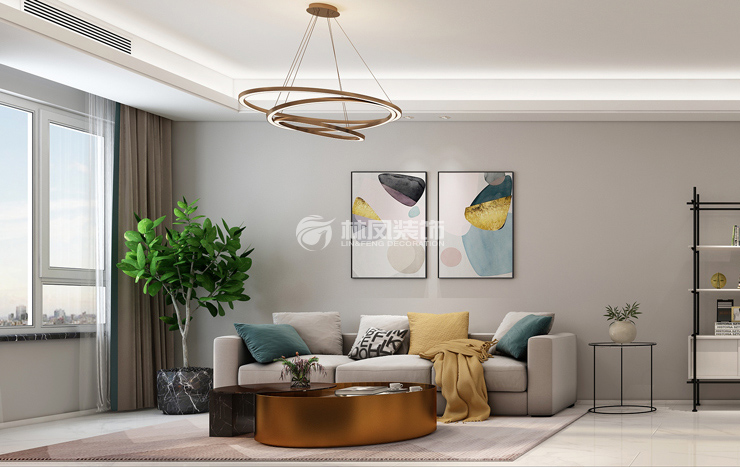 金地檀府85平2居室现代简约风格林凤装饰的客厅大面积以灰色为主调,电视背景运用了前后凹凸层次感的白色造型,与墙面灰色形成对比,使整体空间更干净简洁。电视嵌入造型墙、电视下方的条形茶镜起到了点睛之笔,打破了传统造型的单一的特点,使其造型关系更加完整。