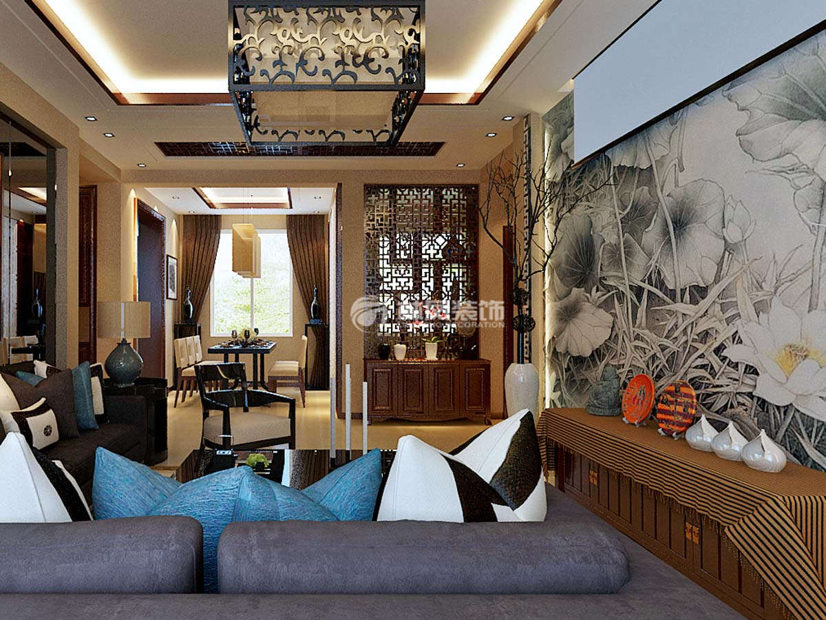 保利达江湾城120平3居室新中式风格林凤装饰的客厅家具及装饰基本选择黑色做主色调,寻求与其它空间的反差,凸显客厅的与众不同,电视背景选择壁画而非壁纸或壁布,更是多些自然、随和的气息,沙发背景选用黑色烤漆玻璃,让空间更显质感与时代感。