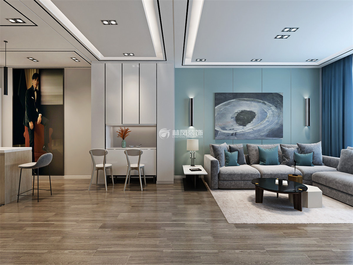 亚洲城90平2居室现代风格林凤装饰的客厅选用雅士白得理石背景墙,和薄荷蓝的沙发背景,凸显现代风格的简约与时尚,木质地板添加了一份质感,使整个感更加干净而明亮,散发着简约的艺术之美.