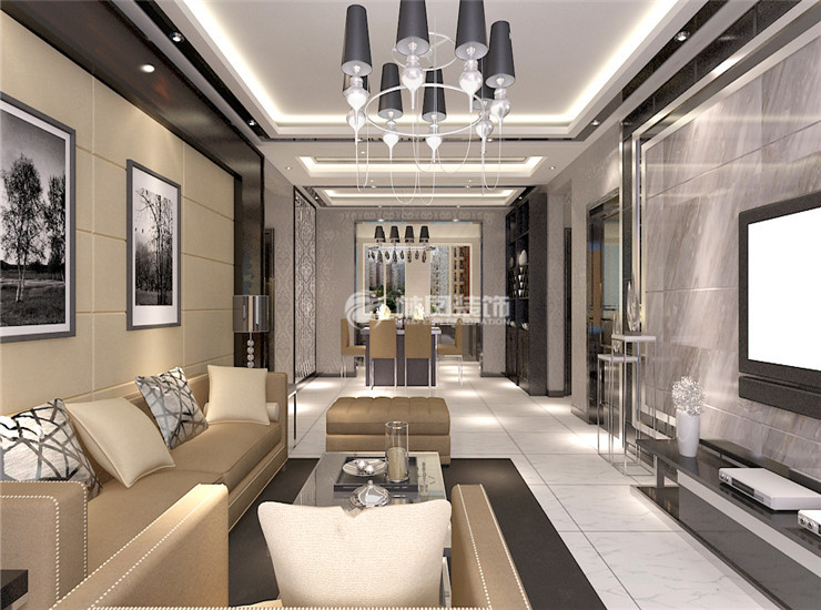 郡原小石城144平3居室现代轻奢风格林凤装饰的室内主色调以黑白灰为主,局部采用黑的烤漆玻璃线条来搭配,驼色的皮质沙发给人一种稳重感,白色理石纹理的地面,银色的墙面,还有吊顶的棚面,空间一下子就活泼起来,电视背景墙采用瓷砖上去及硬包和镜片整体搭配,背景墙大气稳重。