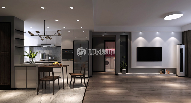 碧桂园繁华里86平2居室现代风格林凤装饰的餐厅由于女业主一人居住,所以不需要太大的餐桌,我将餐桌设置在橱柜延伸出来的岛台上,减少了空间的浪费,增加了空间的趣味性。