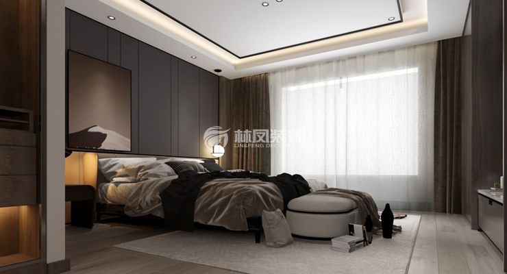 碧桂园繁华里86平2居室现代风格林凤装饰的卧室用硬包装饰床头背景墙,增加舒适和温馨的感觉,整个房间没有设置大衣柜,减少压抑感,使视觉更宽敞舒适。