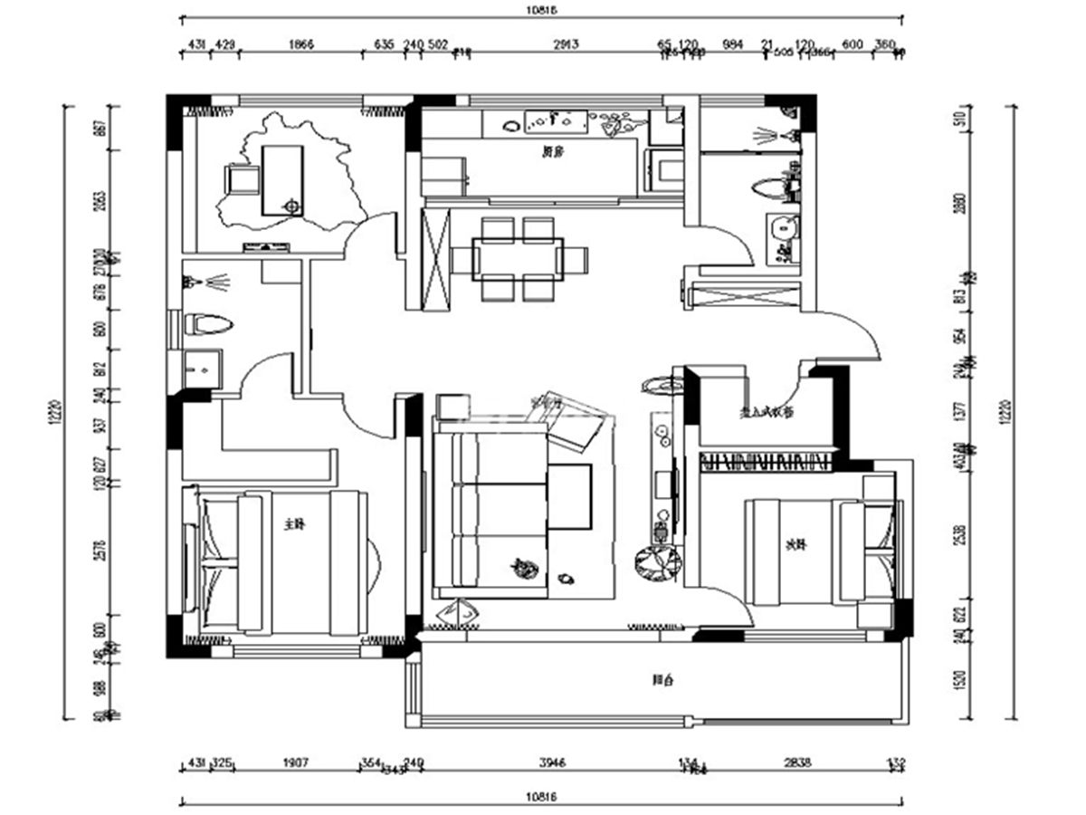 三室两厅一厨两卫,高层整体采用美式风格,色调以深色为主,体现美式的居家感和温馨感。
