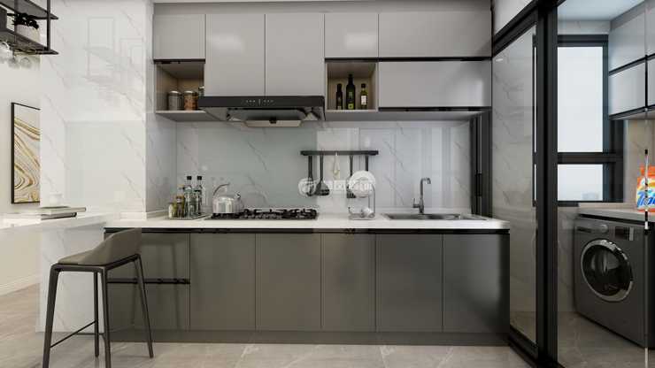 华润二十四城107平三室两厅现代轻奢风格林凤装饰的厨房,似乎90后的年轻人对厨房要求都不高,水槽,烟机炉具对于他们已经是很多的存在,但吧台一定要有,女主说一直有个吧台梦,好吧,我给你实现。