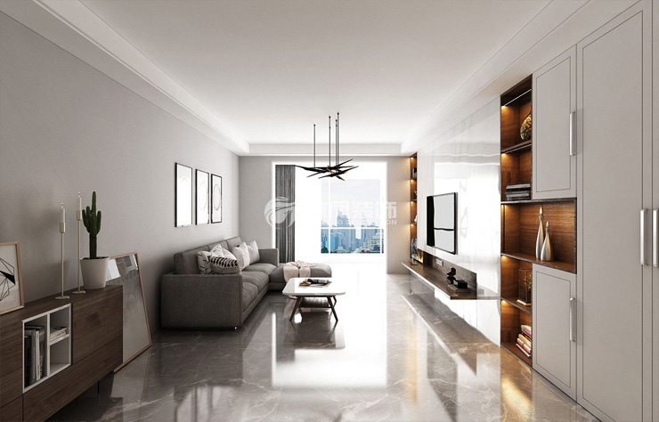西江苑120平两室两厅现代风格林凤装饰的客厅区域依旧整体黑白灰色系,电视背景墙的设计,则主要采用带有储物功能,展示功能的装饰柜,套色的设计,白色烤漆的门板,搭配胡桃木的设计,是正面墙即使是储物柜,也没有很闷,很单一的感觉。同时理石纹理电视背景,以及灰色系布艺的沙发,完美结合,实为极简主义的点睛之作。