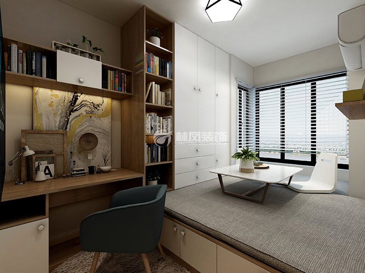 【主卧室说明】主卧室有一个飘窗,是在卧室这个隐私的区域里有一个休闲看书的地方。一直是原木色在为主调。还有壁画作为搭配。所有东西都是暖色调也可以起到舒适和放松心情的作用。