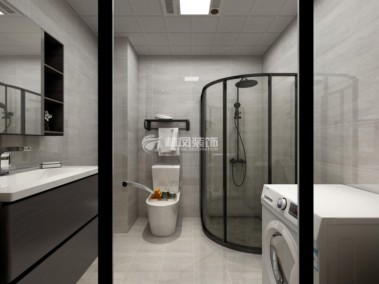 中海寰宇100平两室两厅现代风格林凤装饰的卫生间空间,淡灰色的墙地砖,大面积铺贴,增大卫生间空间感,同时搭配黑色金属材质的五金件,高端大气,干净整洁。